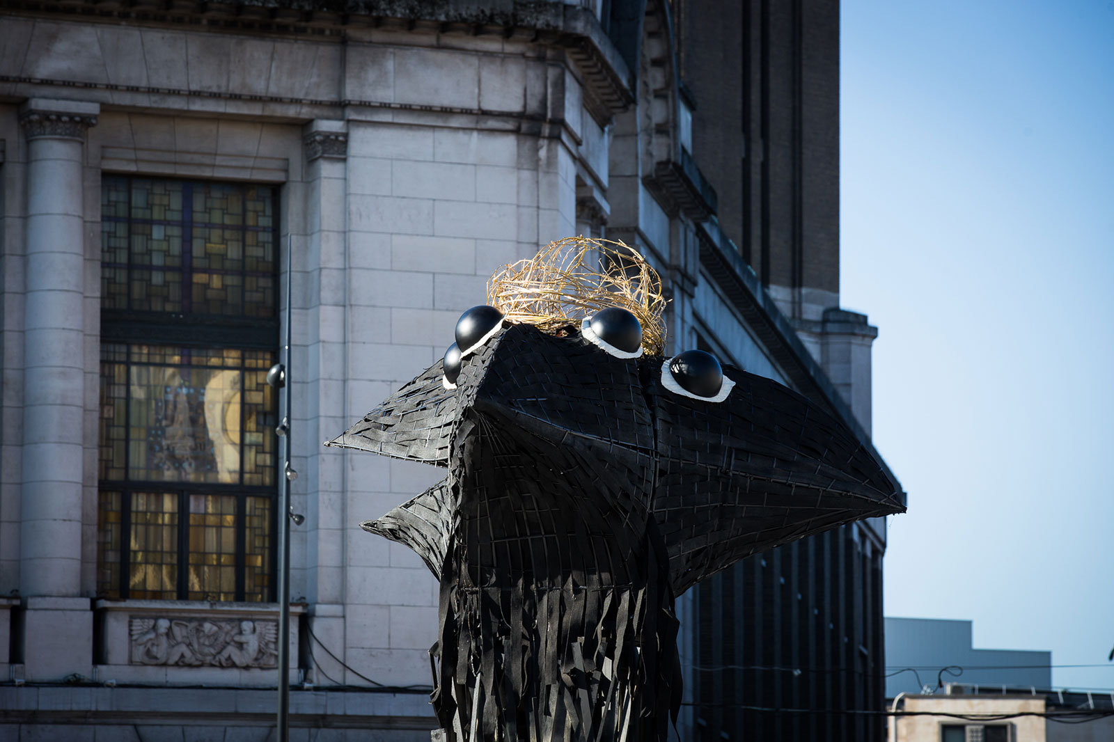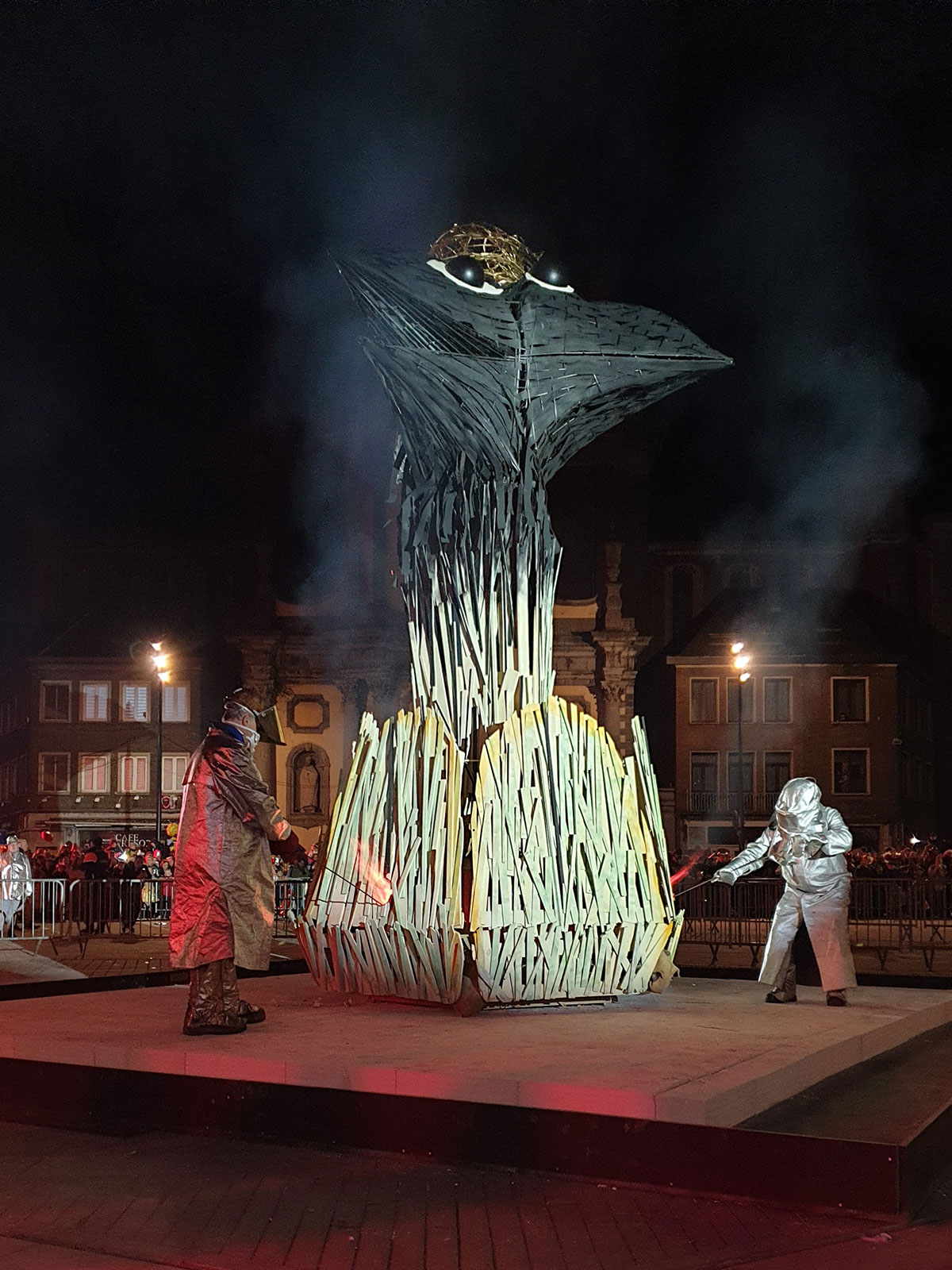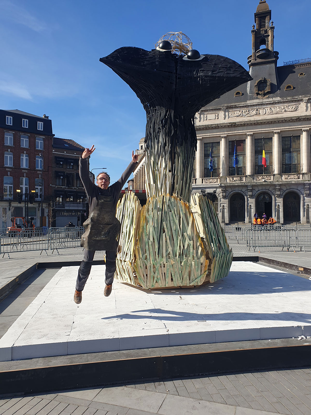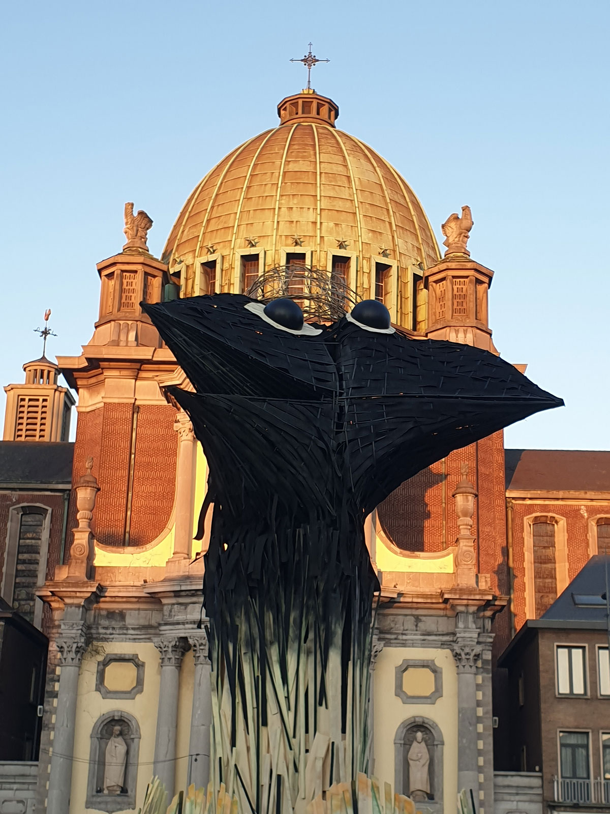Érigés au cœur de la place historique de Charleroi, les corbeaux-totem, tels des cheminées industrielles, ont craché les fumées et les flammes… Habemus futurum.